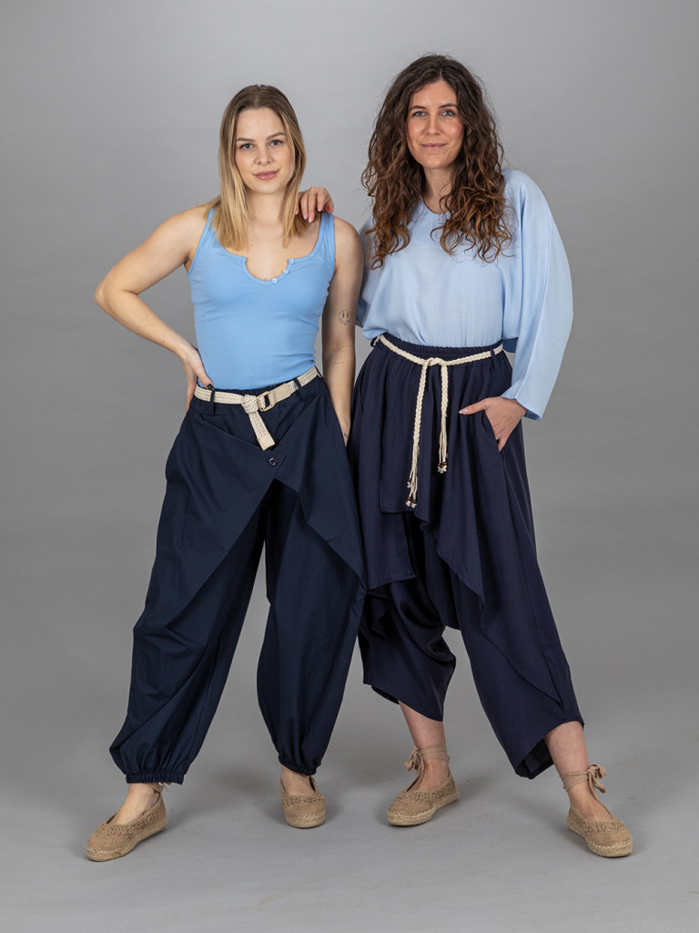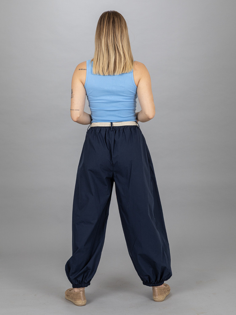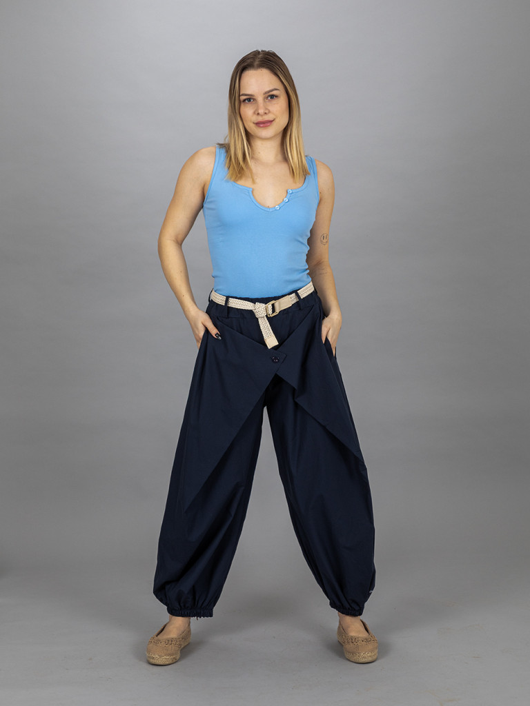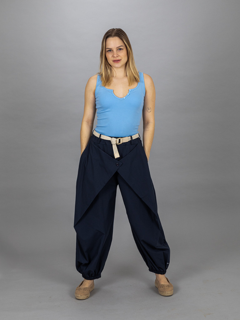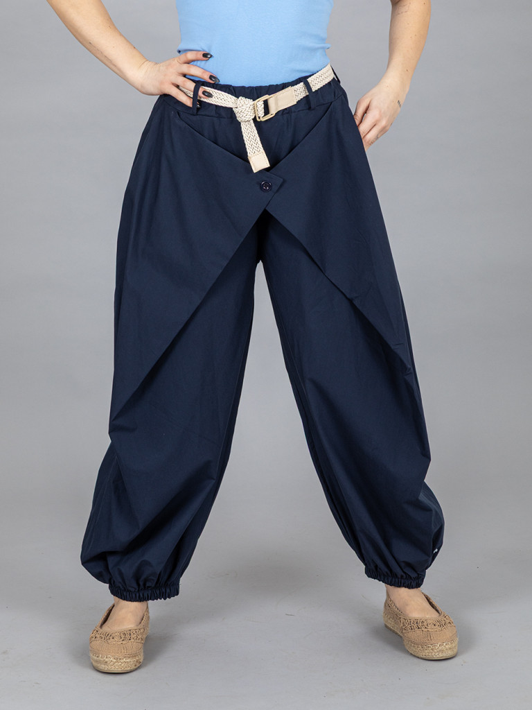 Elől gombos, átlapolt nadrág. Alul gumis bőszárú pamut vászon anyagból. Hátul gumis derékkal. Jobb és baloldalán egy- egy rejtett zseb található. Az öv a nadrág tartozéka. L-es méretig ajánljuk.
