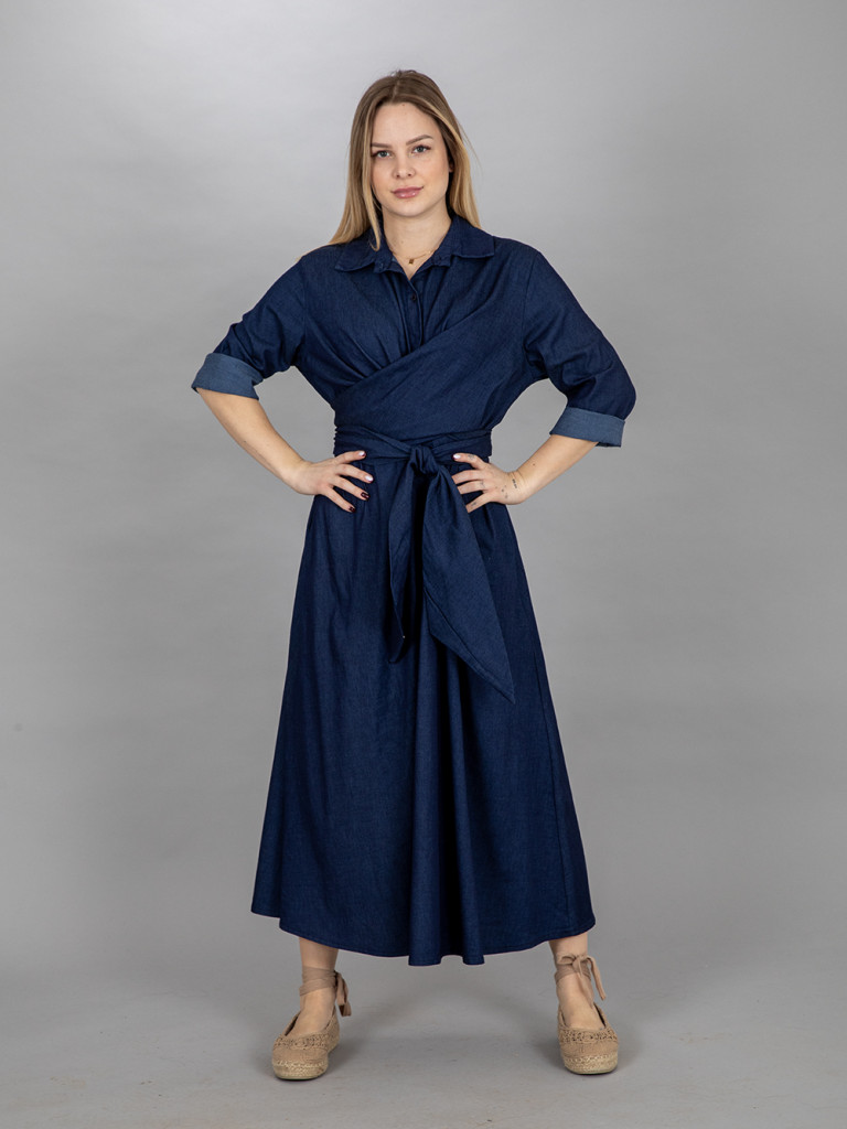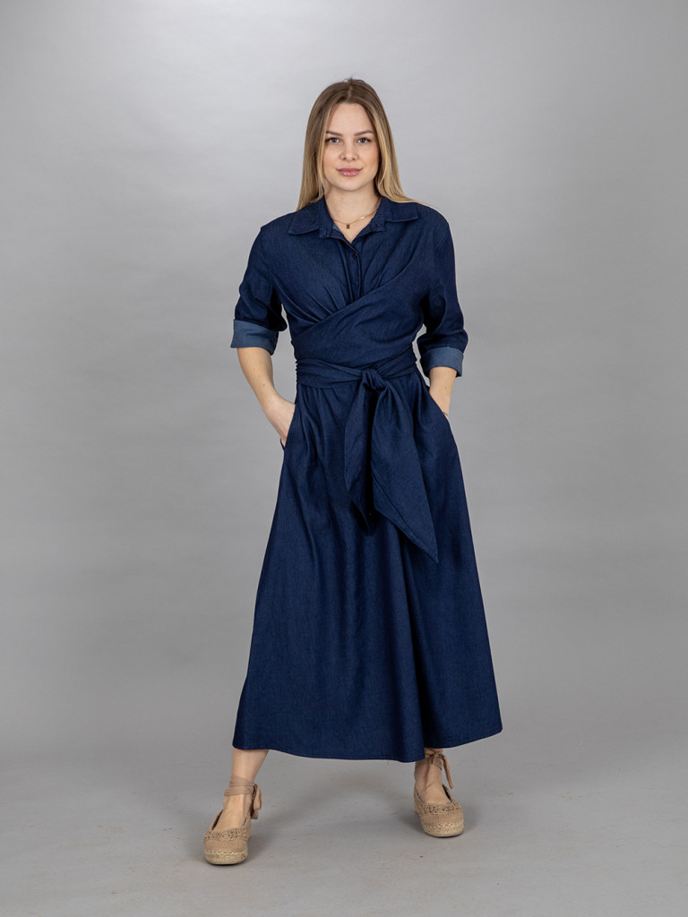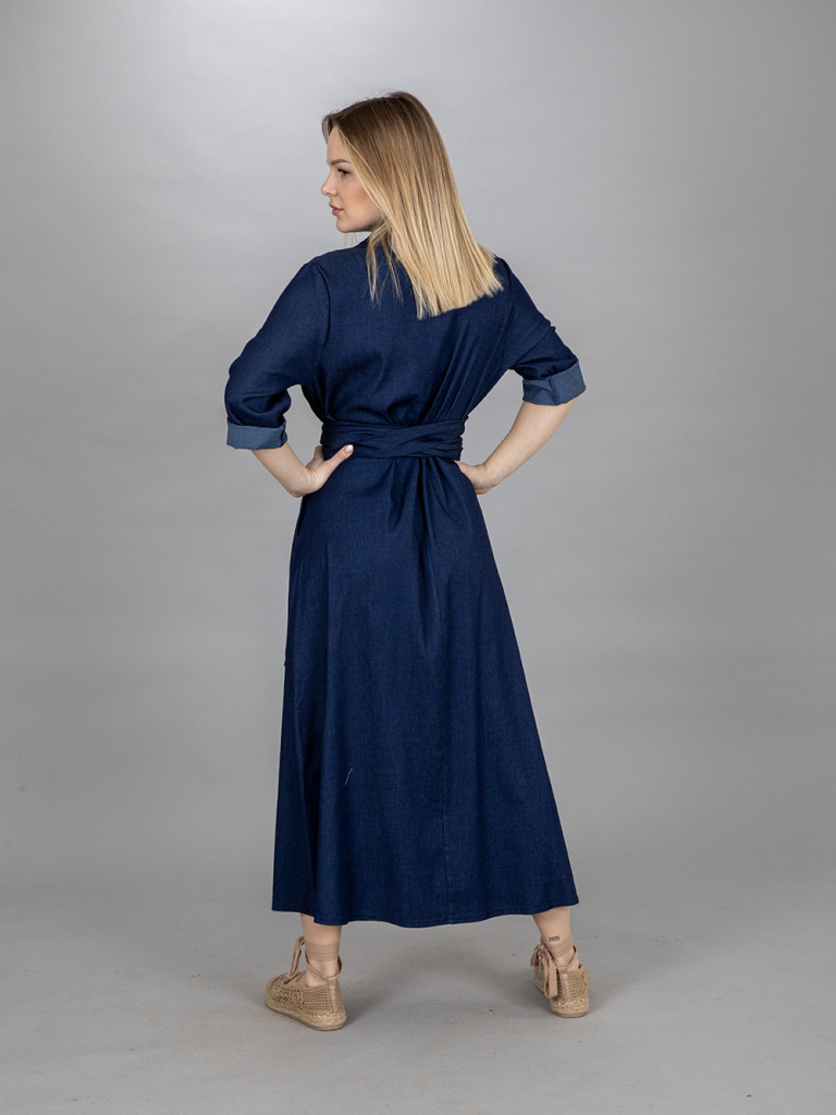 Vékony, farmer hatású, derékig gombos, galléros ingruha. Derekán átkötős övrésszel. 3/4-es ujja felhajtható. Derektól lefelé harangszerűen bővül. Jobb és baloldalán egy-egy rejtett zseb található. XL-es méretig ajánljuk.