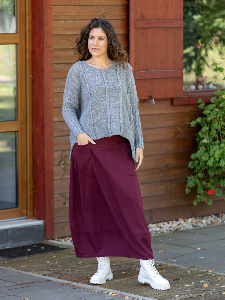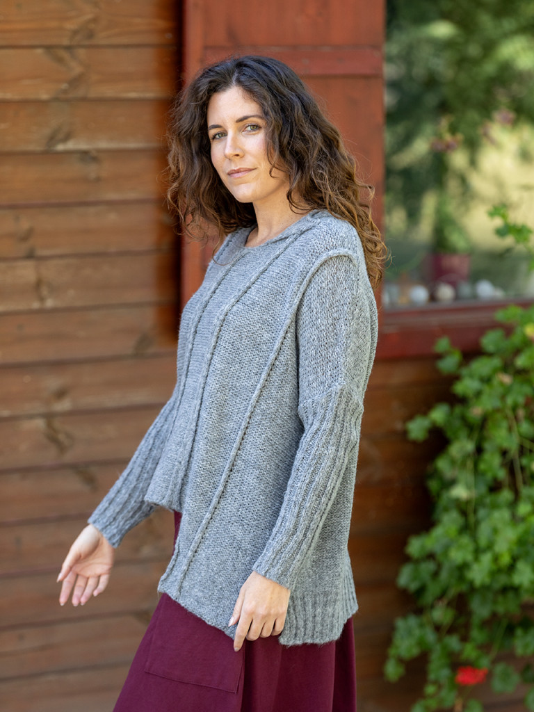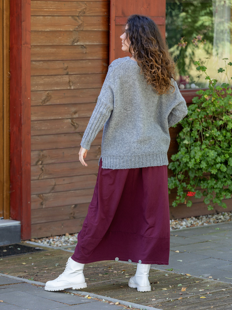 Laza kötésű asszimetrikus aljú pulóver. Ejtett vállal, ujja hosszú passzéval végződik. XL-es méretig ajánljuk.