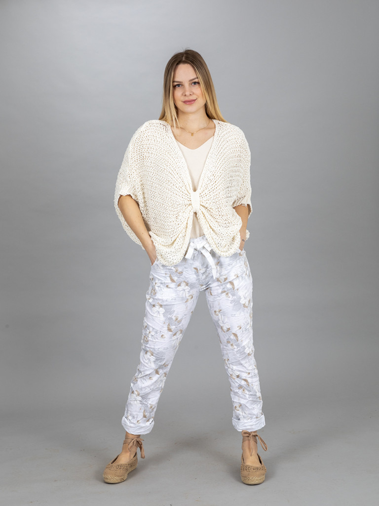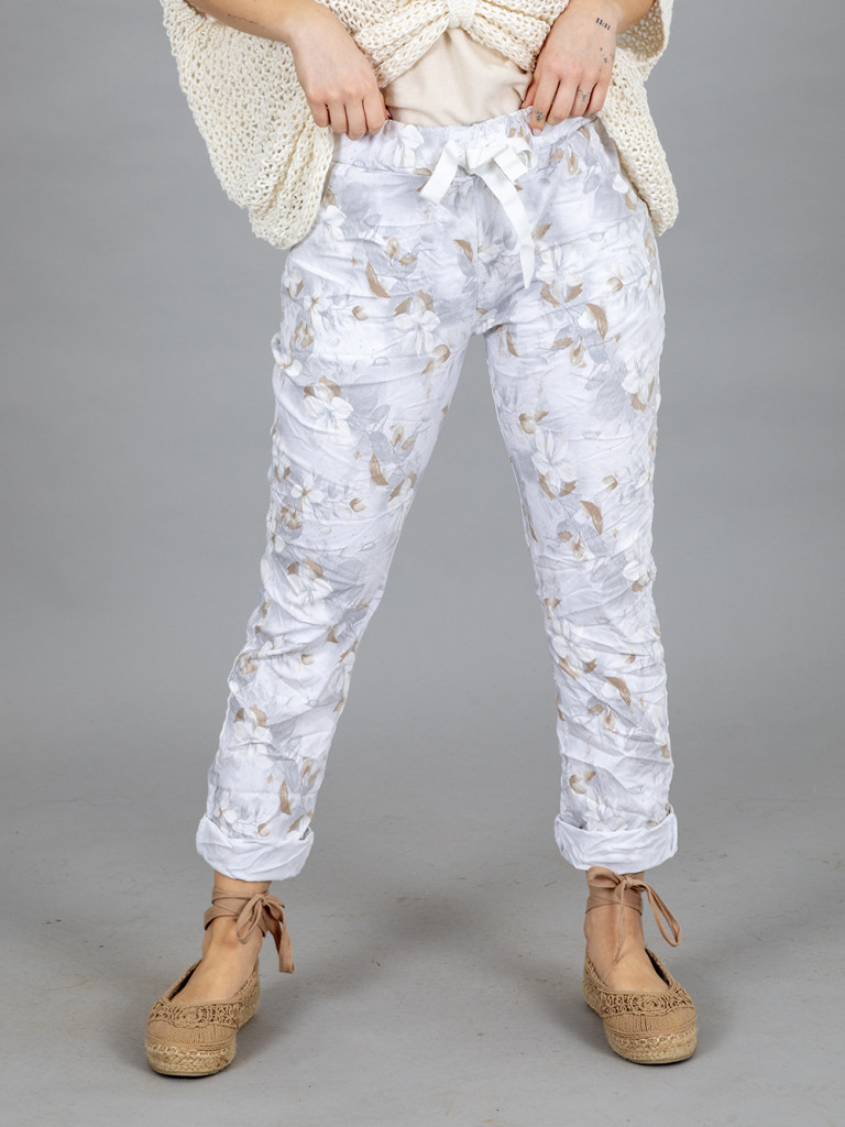 Virág mintás gyűrt nadrág. Dereka gumis, kötővel állítható. Jobb és baloldalán svéd zseb található. Anyaga nagyon rugalmas. L-es méretig ajánljuk.