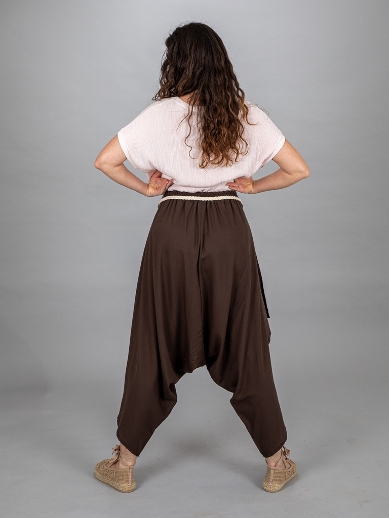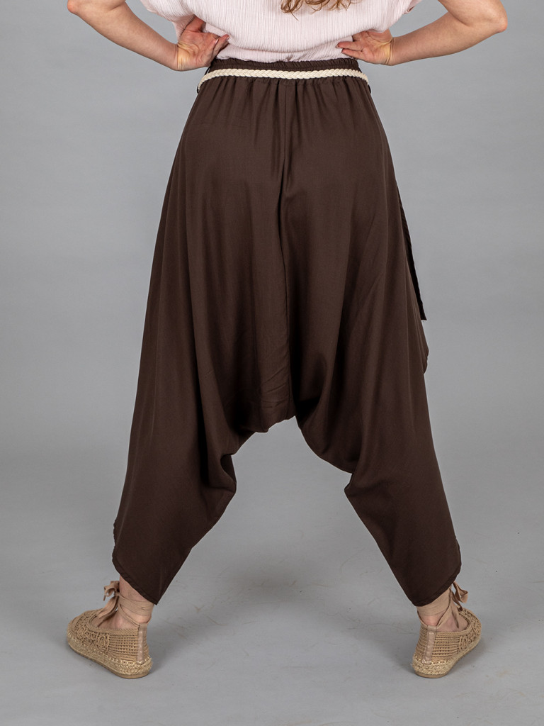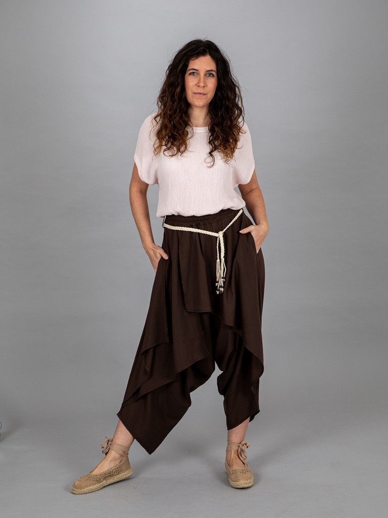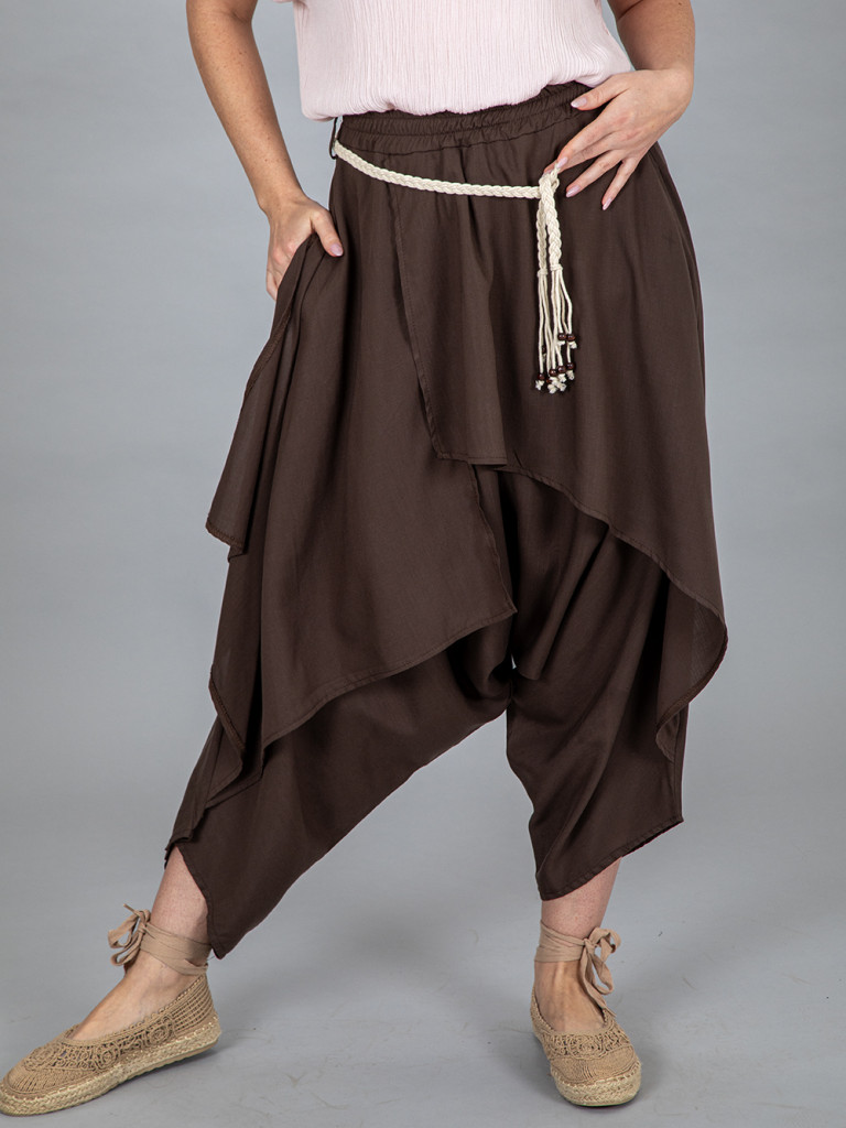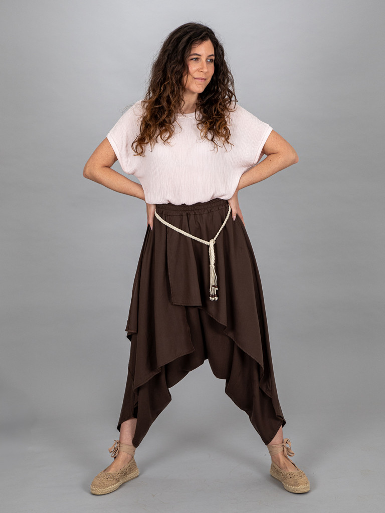 Gumis derekú, mélyülepes asszimetrikus szoknya-nadrág. Jobb és baloldalán egy-egy rejtett zseb található. Elől dupla anyaga teszi szoknya hatásúvá. Az öv a nadrág tartozéka. L-es méretig ajánljuk.