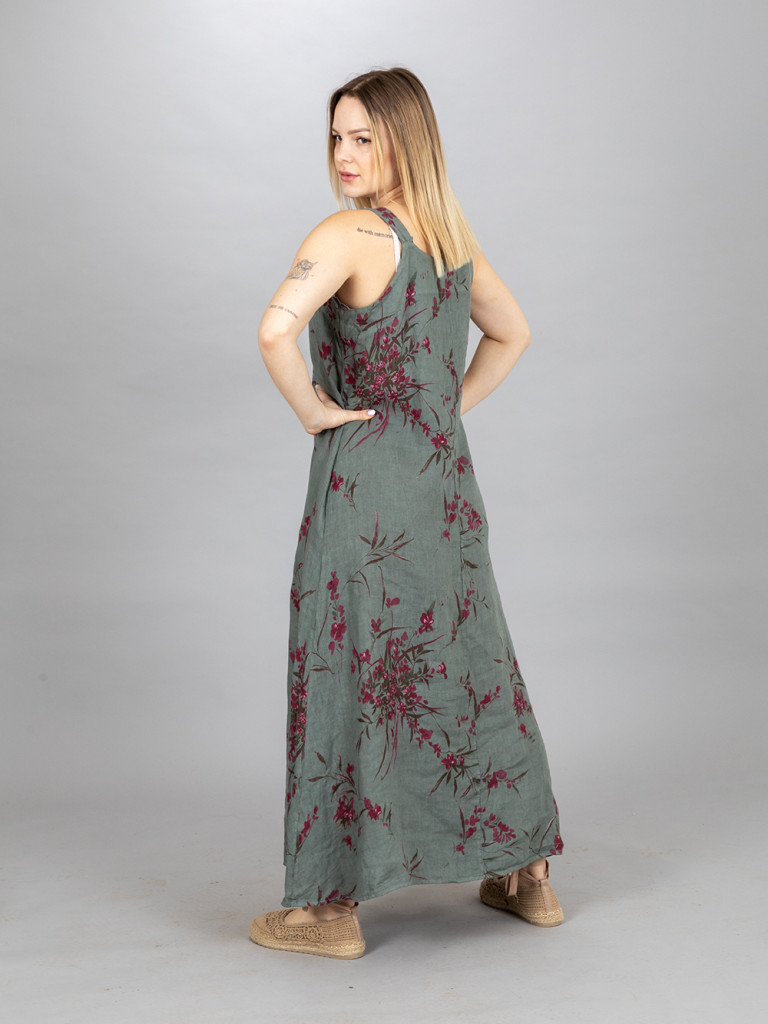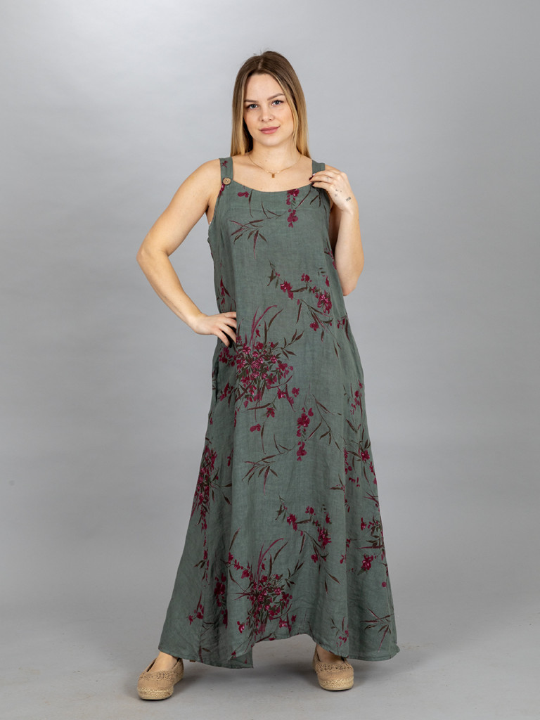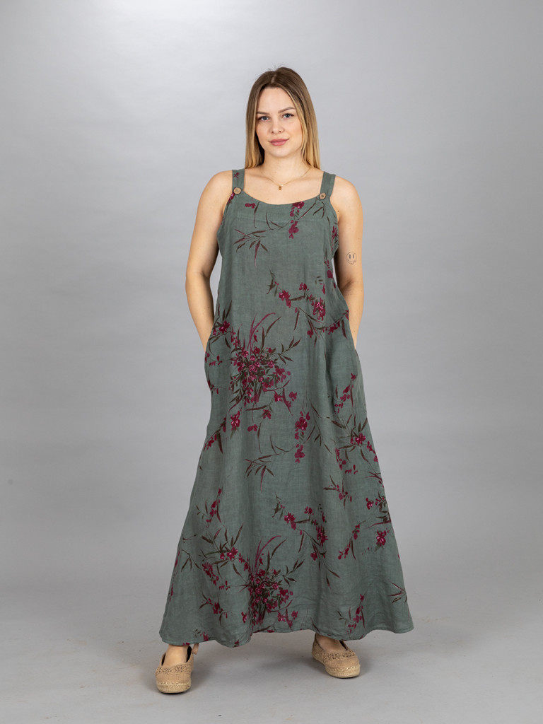 A ruha hossza a pánton levő két gombbal szabályozható. Lefelé bővülő lenvászon ruha. Jobb és baloldalán egy-egy rejtett zseb található. L-es kisebb XL.es méretig ajánljuk.