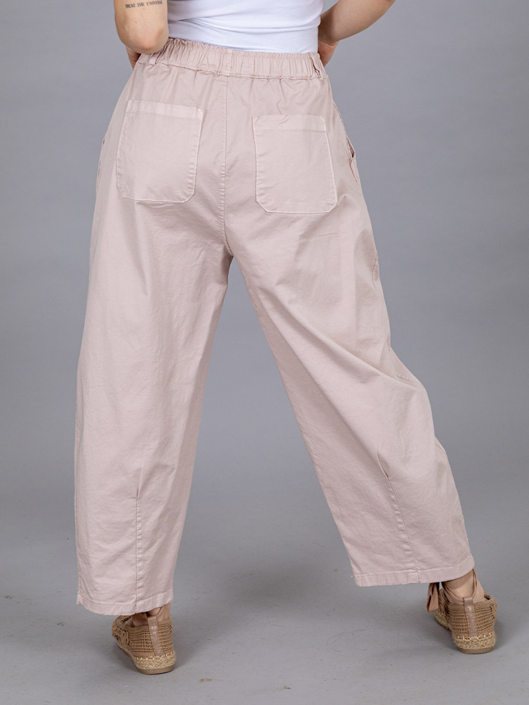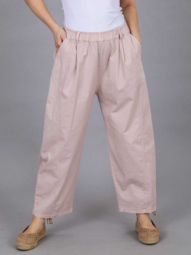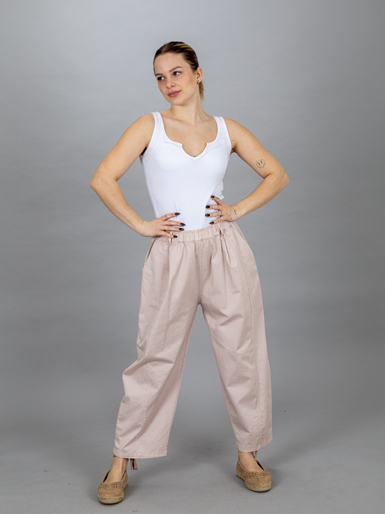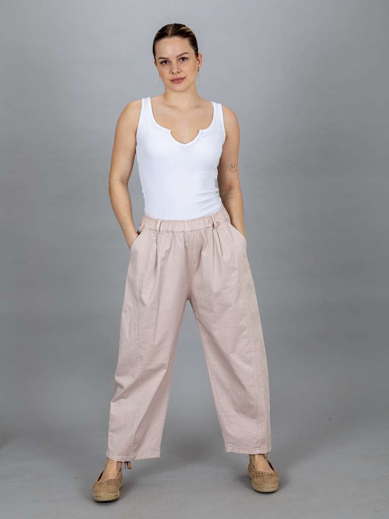 Derekén körgumis pamut vászon nadrág. Szára lefelé szűkülő, 7/8-os hosszúságú. Hátulján két rátett zseb, jobb és baloldalán egy- egy rejtett zseb található. XL-es méretig ajánljuk.
