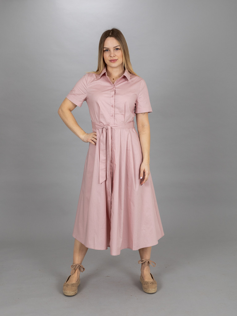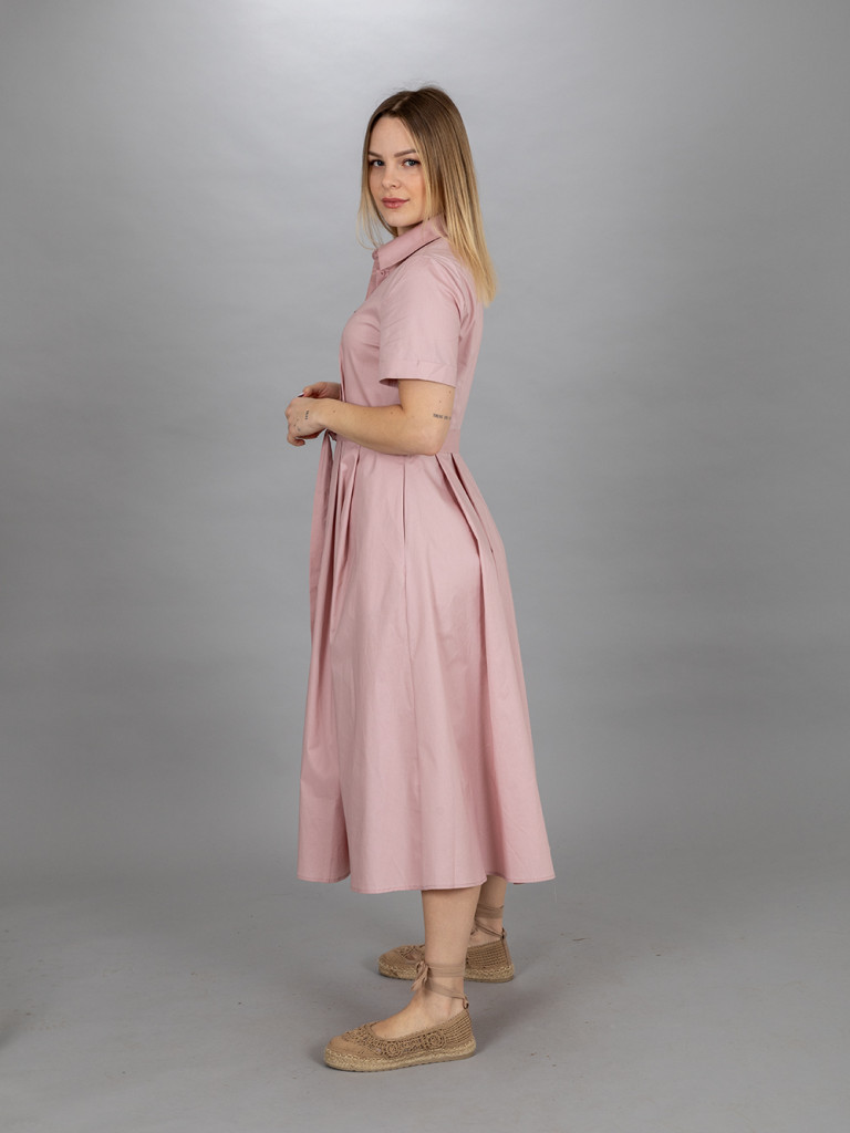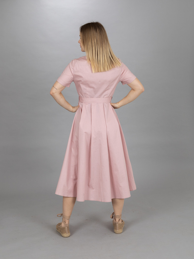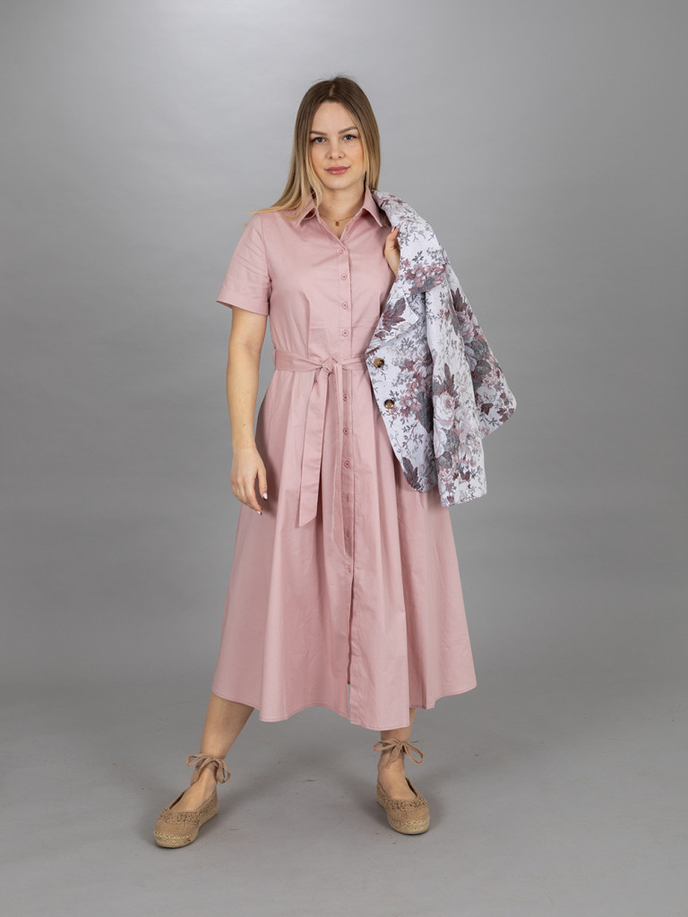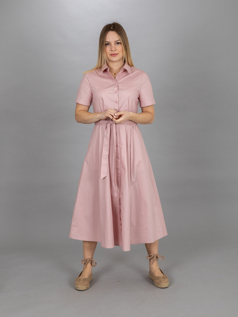Rövid ujjú, galléros végig gombos ingruha. Derekán nagy tűzésekkel, kötővel. Oldalán két zseb. A ruha dinamikusan lefelé bővül. Anyaga enyhén rugalmas.