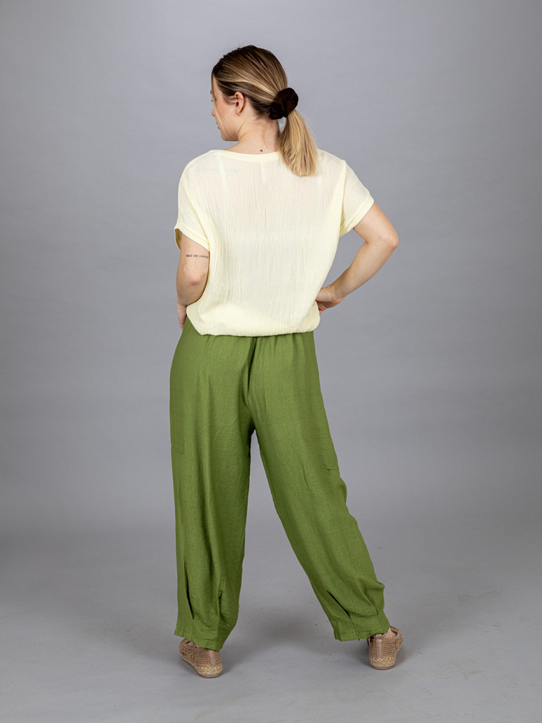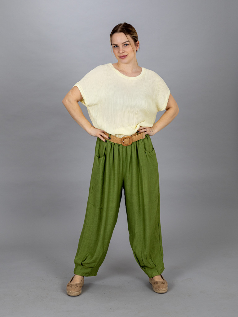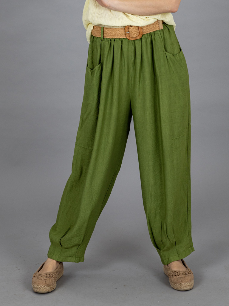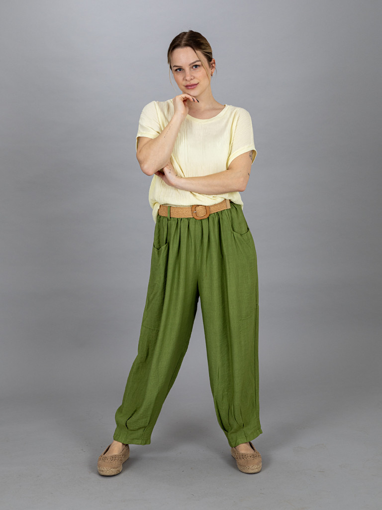 Bőszárú zsebes nadrág, derekán övvel ellátott. Kellemes, vékony viszkóz anyagának köszönhetően könnyű viselet. XL-es méretig ajánljuk.